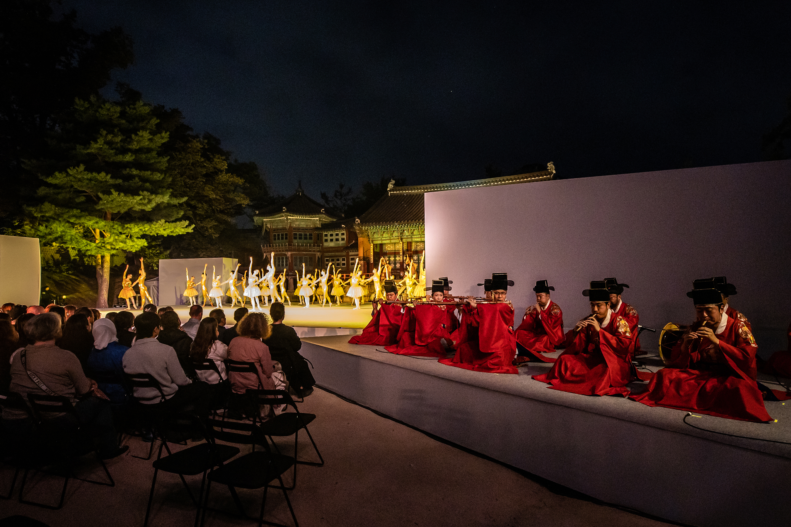 국악 명인 100명이 참여하며, 대취타·여민락·춘앵전 등 전통 궁중 음악의 진수를 선보입니다.